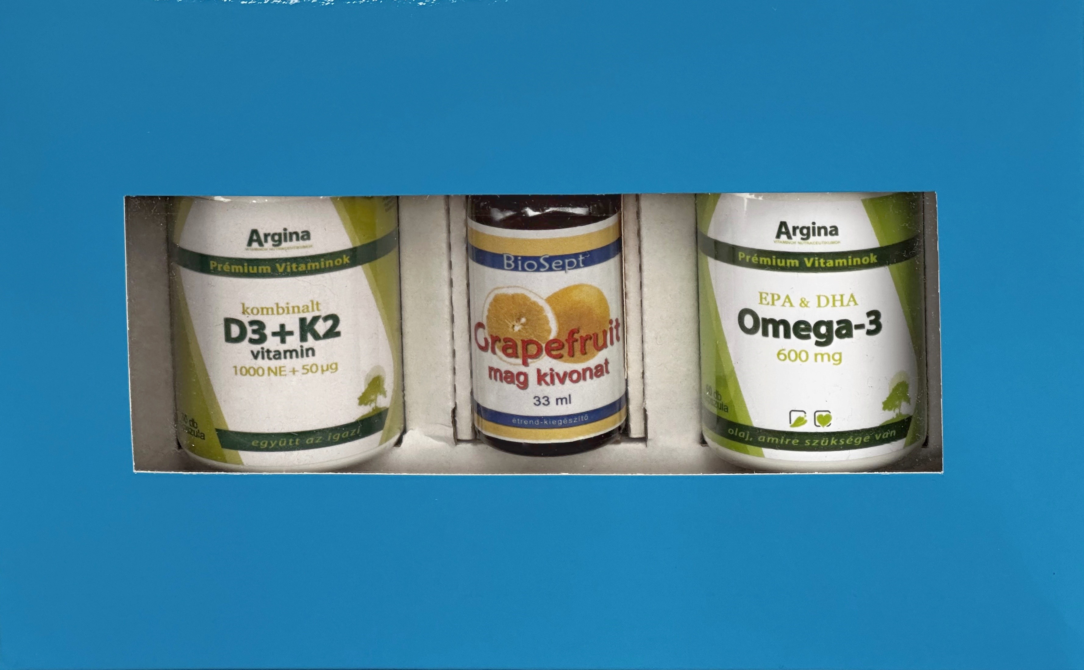 A díszdoboz ajándék önnek. Tartalma: 1 db D3+K2 Vitamin 90 kapszula (fehér flakonban) + 1 db BioSept Grapefruit mag kivonat + 1 db Omega-3 600 60 db kapszula (fehér flakonban)